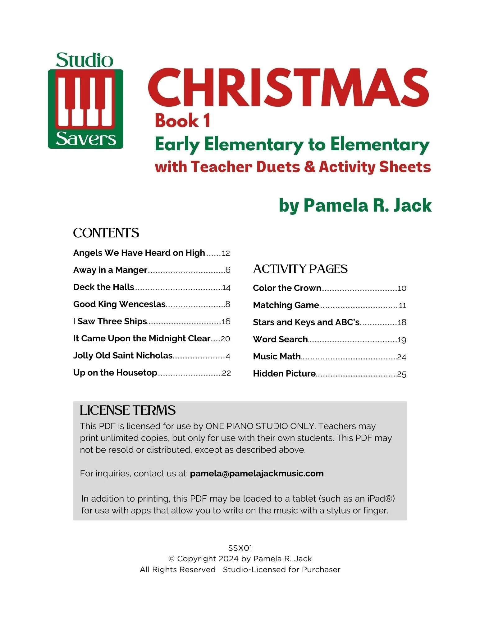 Start with my Studio Savers Christmas Collection Book One with fun activity sheets for Early Elementary to Elementary pianists and Studio Savers Christmas Collection Book Two for Late Elementary to Early Intermediate pianists. Give your students the entire book or pick and choose the pieces that suit them best.